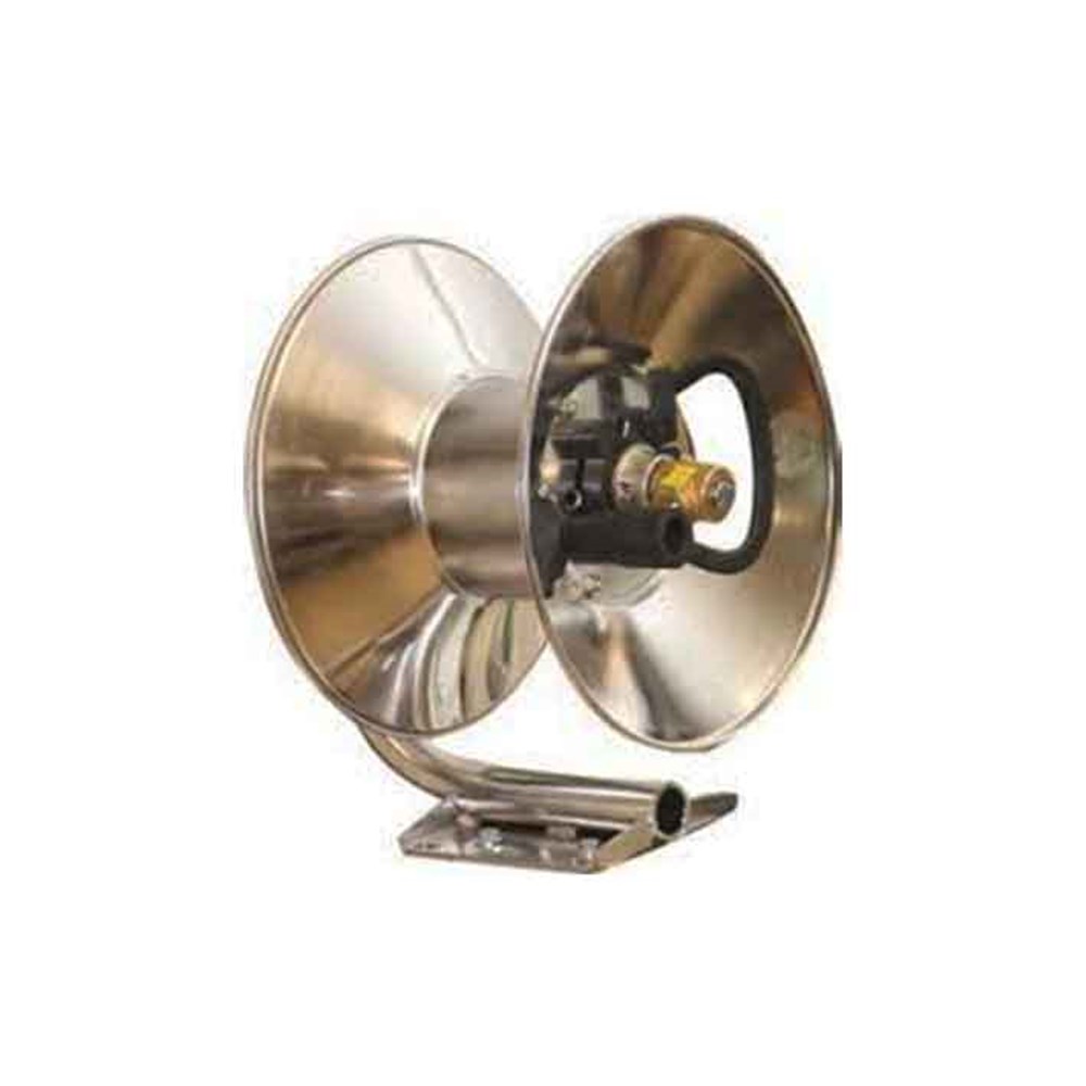 Heavy duty hose reel for high pressure hose with mounting plate for mounting onto the tray of a truck bed or onto the wall, stainless steel construction offers better resistance against harsh environments